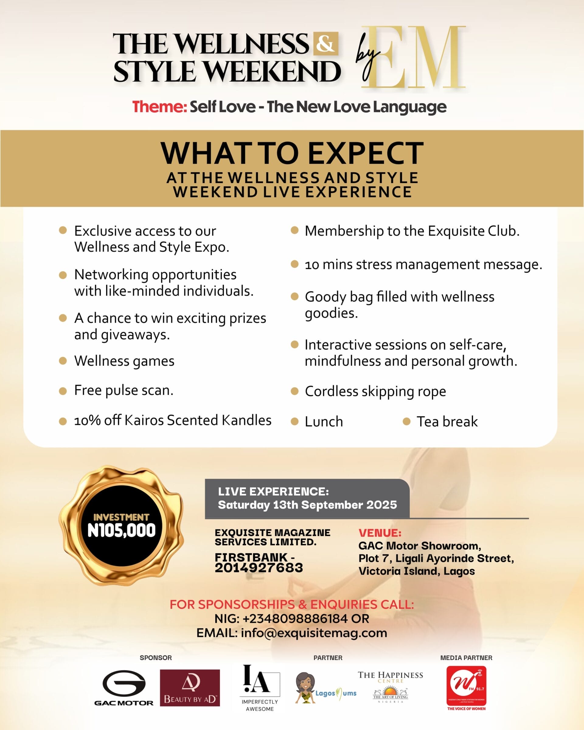 Exquisite Magazine has announced that it will be hosting the Wellness and Style Weekend in Lagos on Saturday, September 13, 2025, at the GAC Motor Showroom, Plot 7, Ligali Ayorinde Street, Victoria Island.